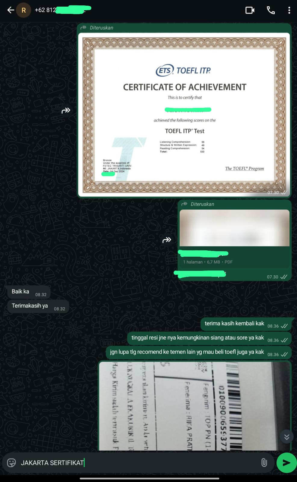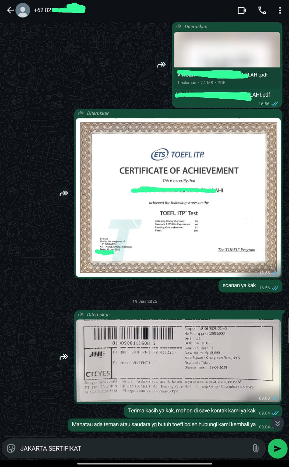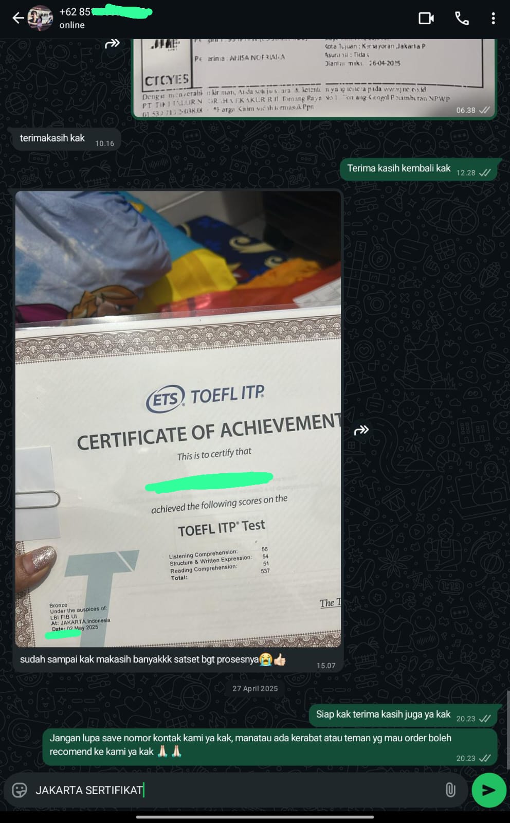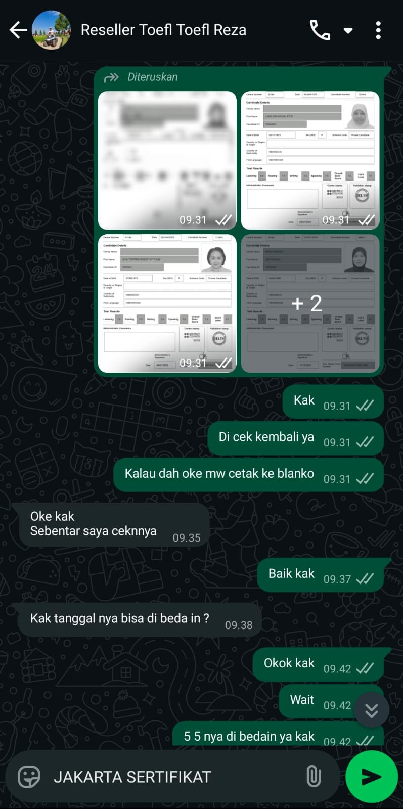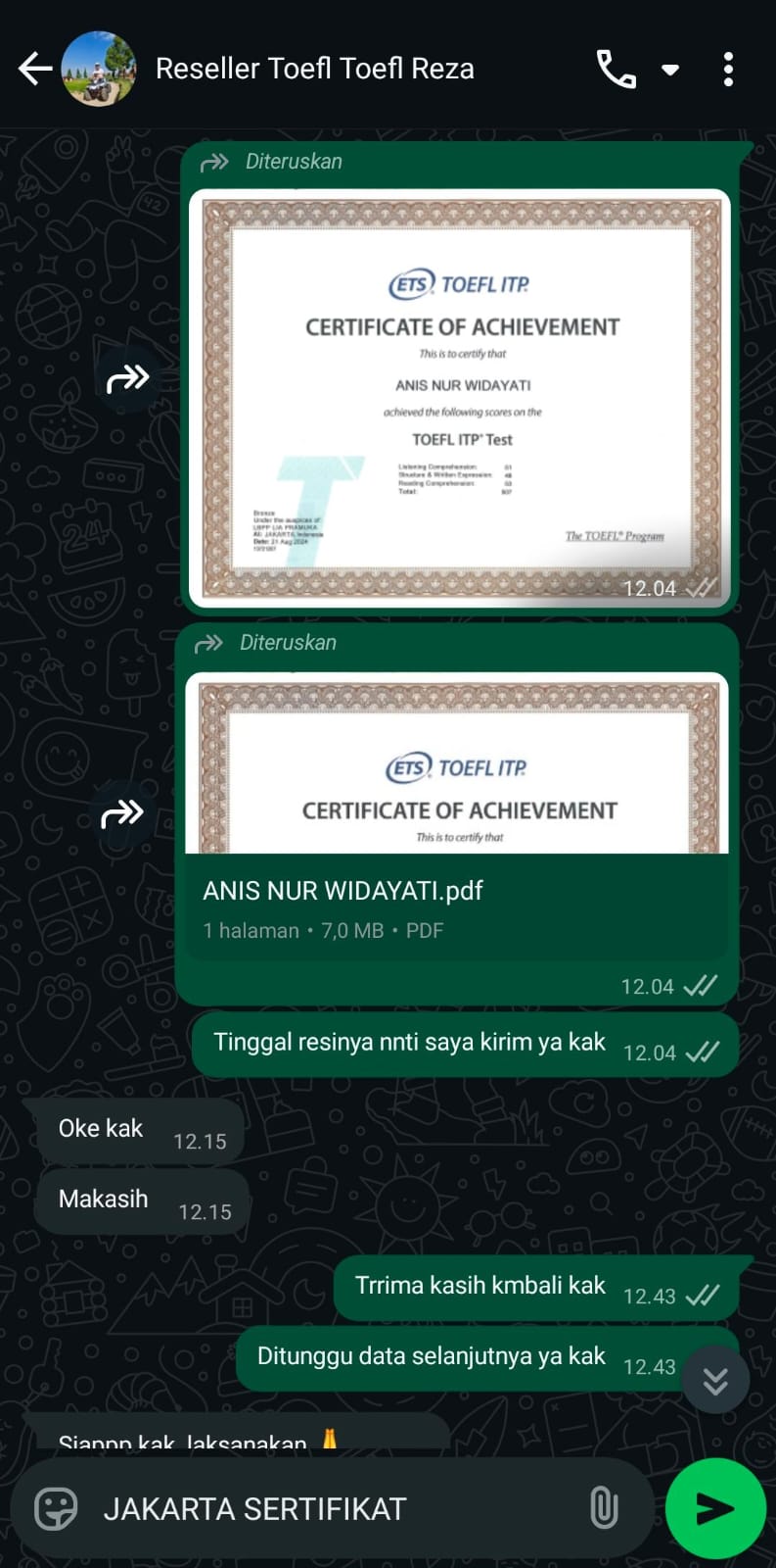 Jakarta Sertifikat adalah mitra terpercaya yang membantu Anda mendapatkan sertifikat TOEFL/IELTS resmi dan asli tanpa perlu repot mengikuti ujian. Cukup hubungi kami, sampaikan kebutuhan Anda, dan biarkan tim profesional kami menangani sisanya.