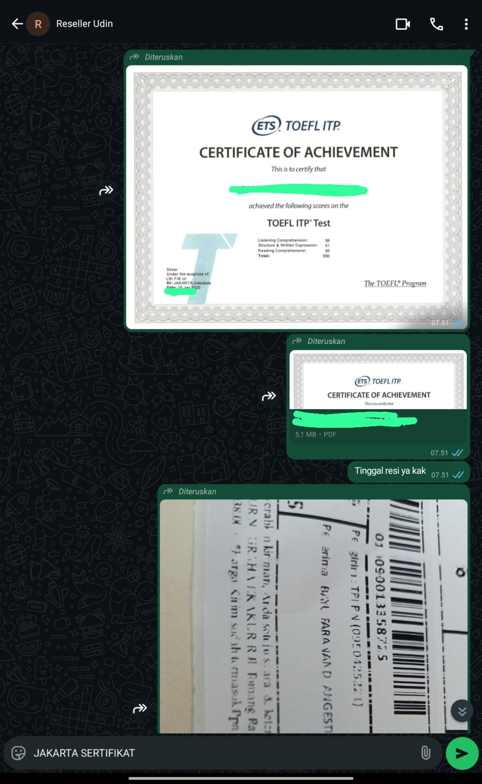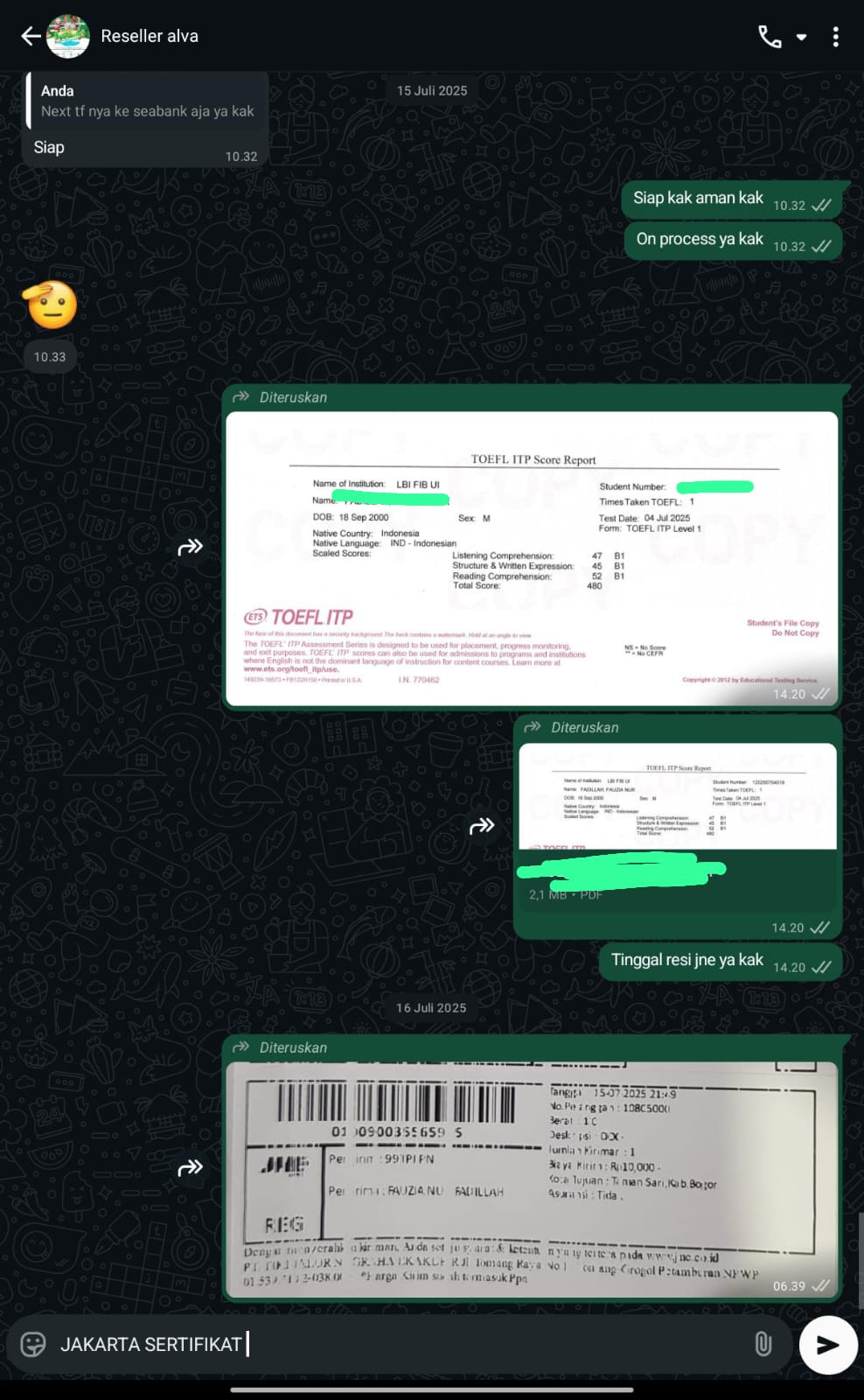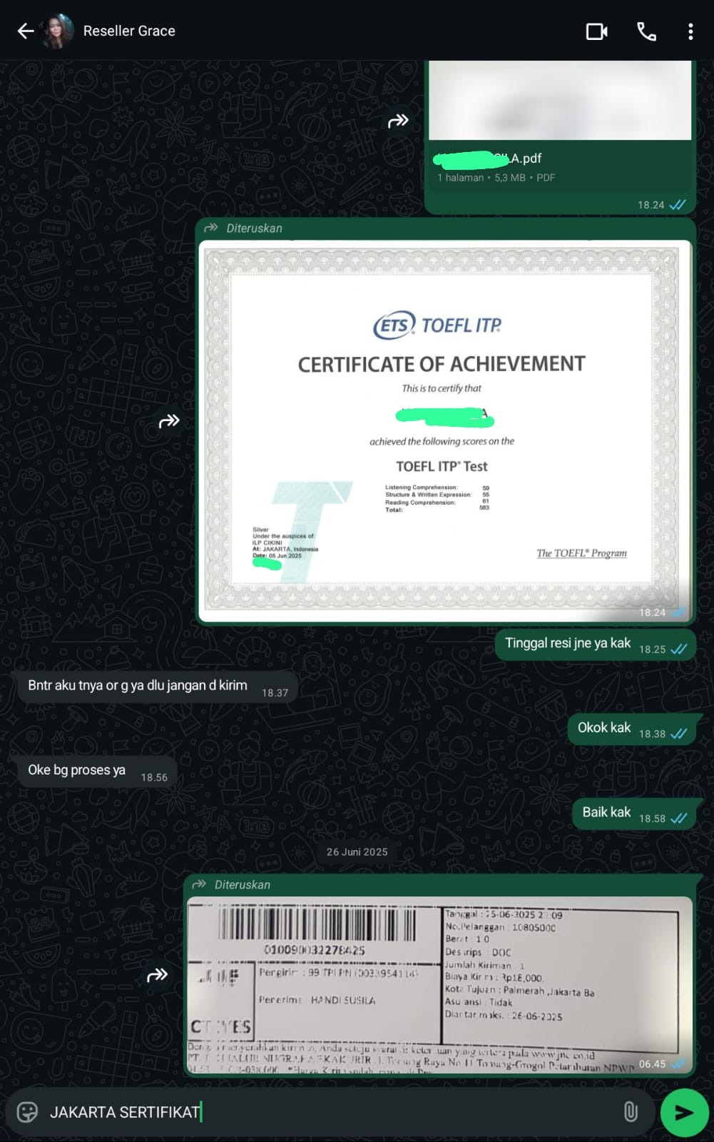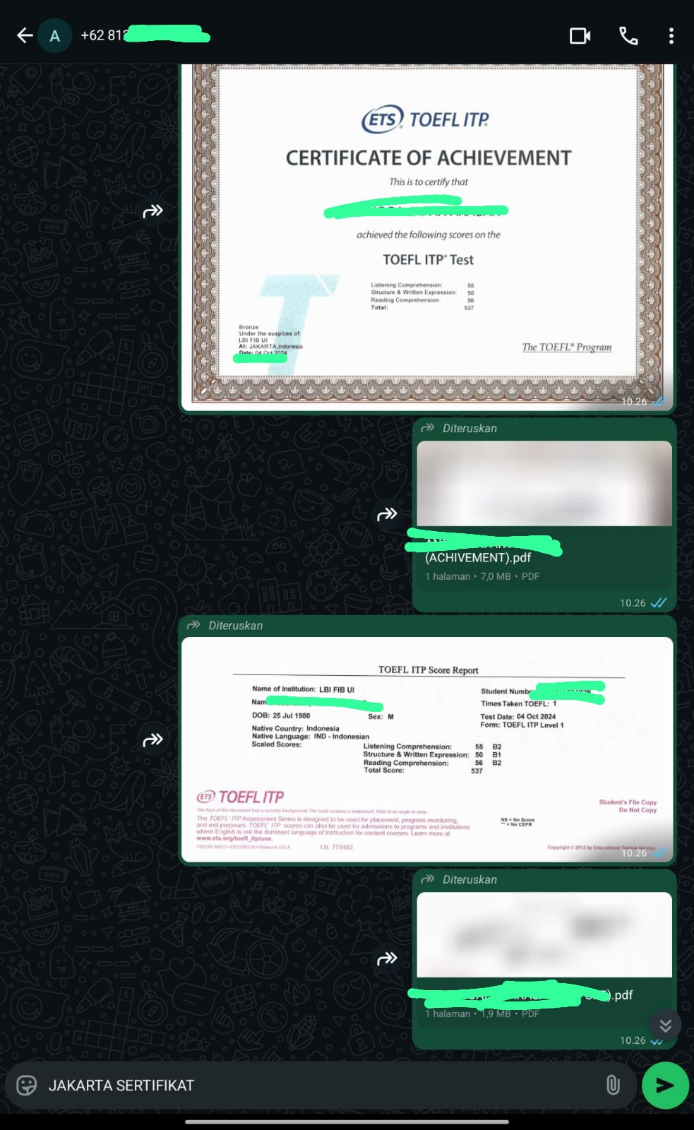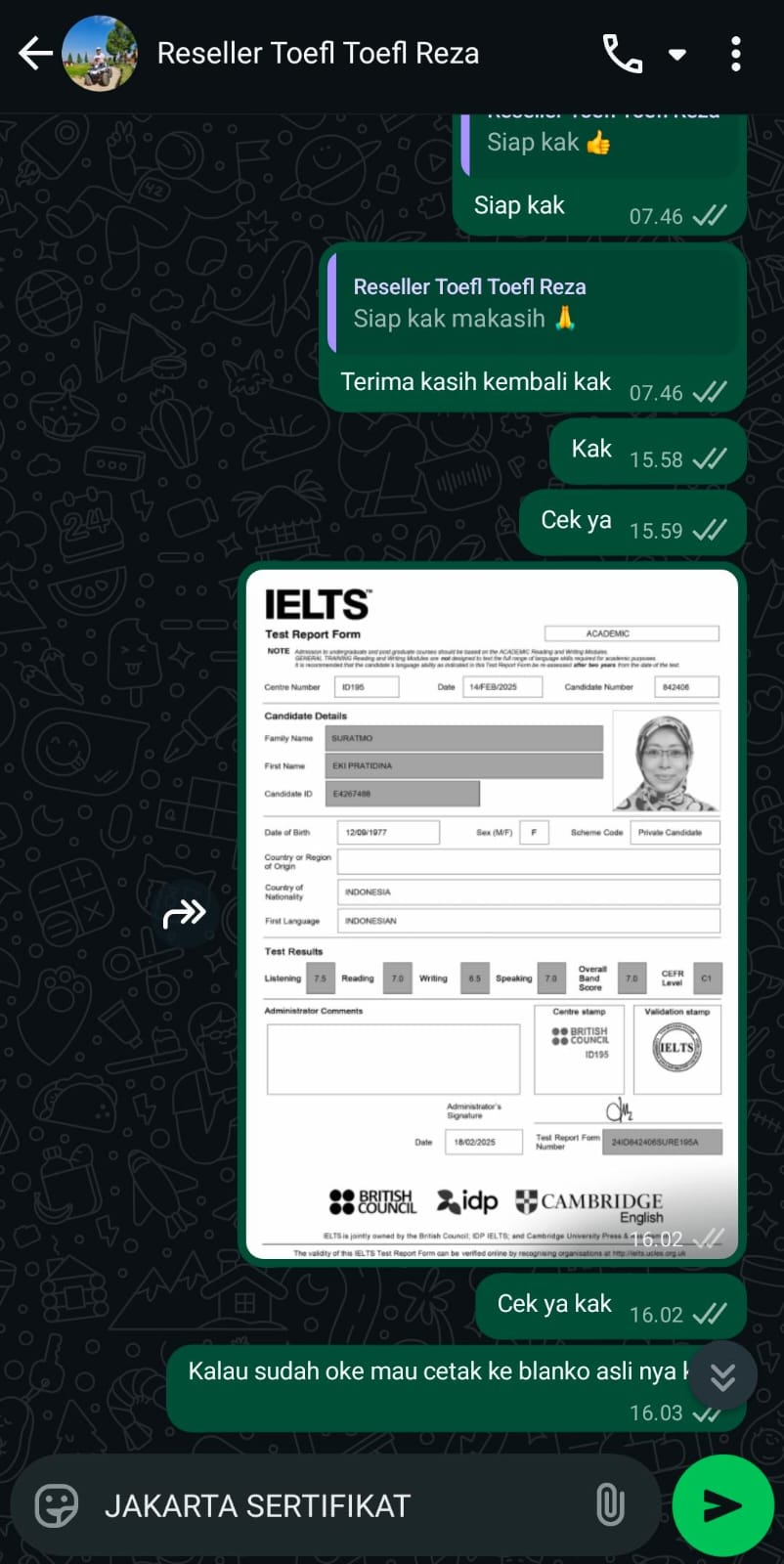 Jakarta Sertifikat adalah mitra terpercaya yang membantu Anda mendapatkan sertifikat TOEFL/IELTS resmi dan asli tanpa perlu repot mengikuti ujian. Cukup hubungi kami, sampaikan kebutuhan Anda, dan biarkan tim profesional kami menangani sisanya.